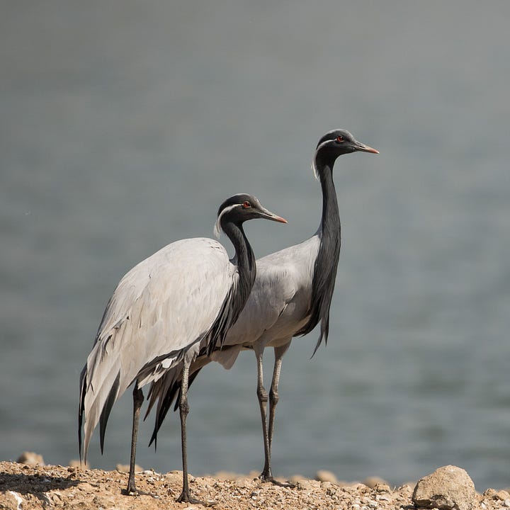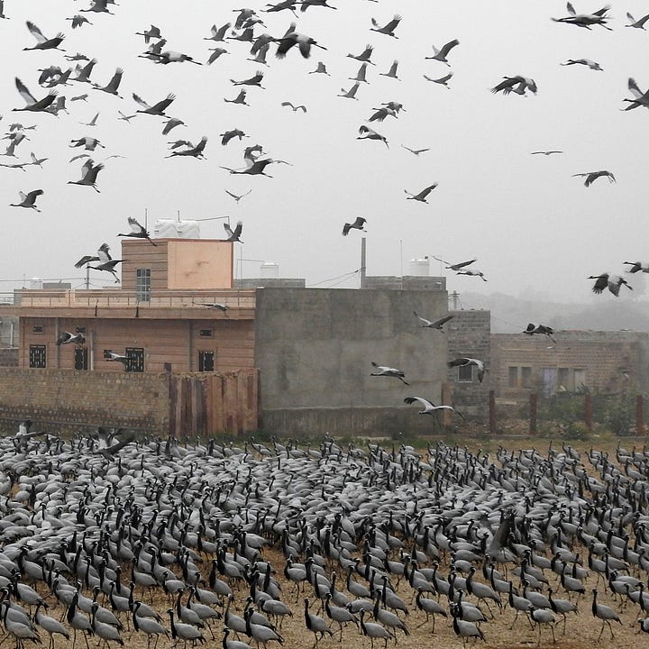 A lot of the villagers are Jains, and they feed the Demoiselle cranes with grain as the birds migrate further south. It is an amazing sight, and now a well-respected ritual. Apparently, this started as recently as four decades ago with a few hundred birds. Now, around 25,000 cranes visit the village annually, and it also attracts tourists. While all human-animal interactions can have unexpected consequences, we are cautiously optimistic about this story.