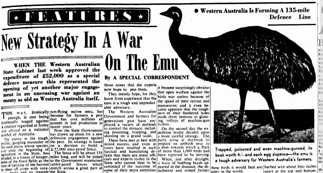 As was reported at the time, “The emus have proved that they are not so stupid as they are usually considered to be. Each mob has its leader, always an enormous black plumed bird, standing fully six feet high, who keeps watch while his fellows busy themselves with the wheat. At the first suspicious sign, he gives the signal and dozens of heads stretch out of the crop. A few birds will take fright, starting a headlong stampede for the scrub, the leader always remaining until his followers have reached safety.”